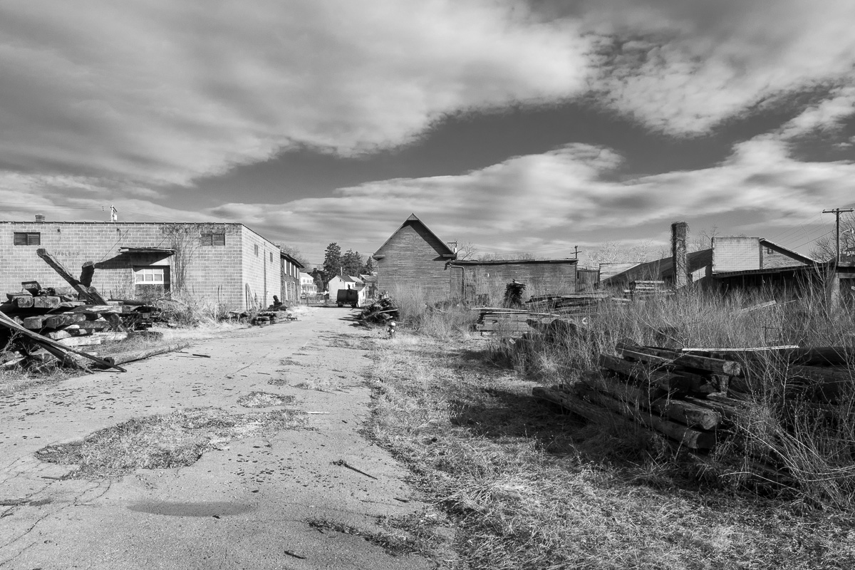 I haven’t been able to find any information about the history of this particular building. Curiously enough, when I search I get a range of “business directories” that list the company as if it is still a going concern. It’s clearly not, at least not in this location, because the north wall (to the right in this photograph) has partially fallen in and the shell of the building is open to the elements. It suggests, however, that the company was active some time in the recent past – at least since the invention of the Internet.