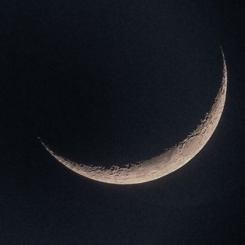Last night looked like it might be nice and clear so I broke out my 8-inch Dobsonian Telescope. It’s an old classic from Coulter Optical and still works pretty well. It was a really lovely evening and the highlight was the two-day old crescent moon that appeared out of the twilight a little while after sunset. Starting to get the hang of the iPhone attachment.