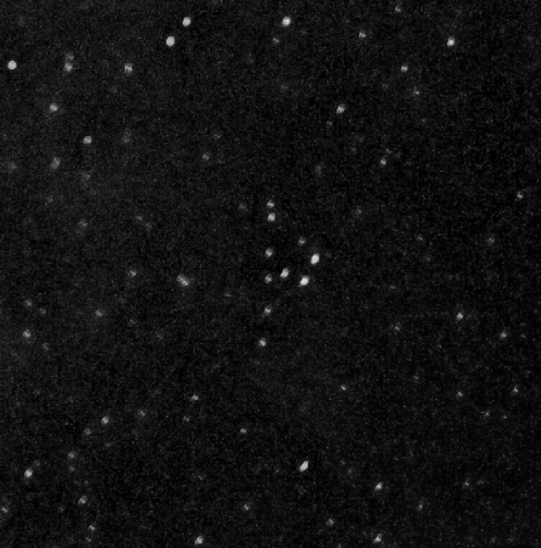 Scanning around this image on the screen I noticed in the lower right corner, a line of star-like objects that were in such a straight line that I wondered if this might be something other than a star. An asteroid, perhaps. I zoomed in and cropped that area: