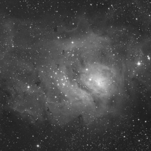 This is an image of a huge cloud of gas and dust in the constellation Sagittarius. It is estimated to be 4,000 – 6,000 light-years from us and the size is estimated to be approximately 110 light years across. It reportedly is visible to the naked eye under good sky conditions. It has been named the “Lagoon Nebula”. The nebula is an area of active star formation. For more information, check out the Wikipedia entry.
